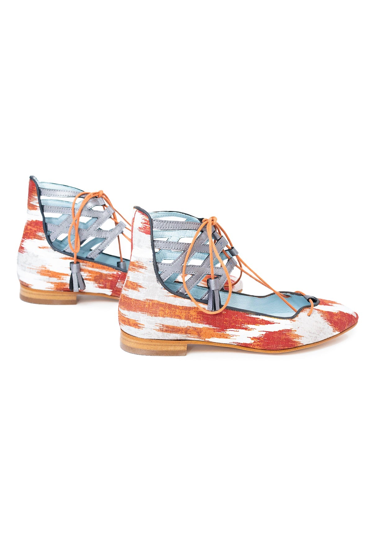 Dublín Roca es un modelo semi-botín que recoge el tobillo con una pieza de piel en tono gris antracita y va atado en la zona delantera, con un cordón de algodón con borlas de piel. Dublín favorece la silueta del pie por su gran escote delantero y por la pieza del tobillo, con múltiples calados cortados de forma manual, con bisturí, que recoge sin acortar. Una de sus claves es el ribete, cosido con precisión y que hace que el zapato favorezca a cualquier tono de piel. El tejido es de algodón con estampado de lenguas mallorquinas en color teja.