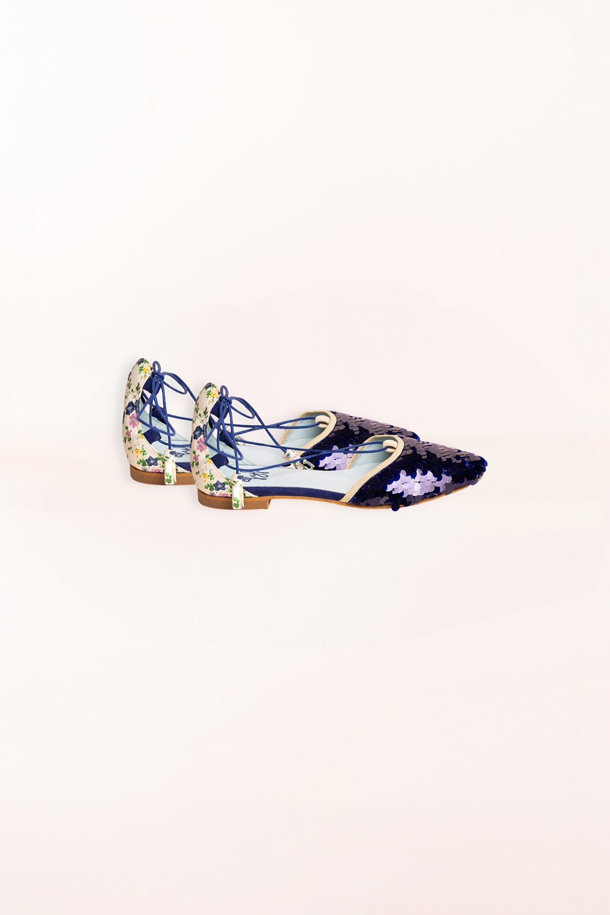 Bailarina con puntera y talonera a contraste con lentejuelas en verde morada y raso estampado. Cordón en azul Klein y borla estampada.